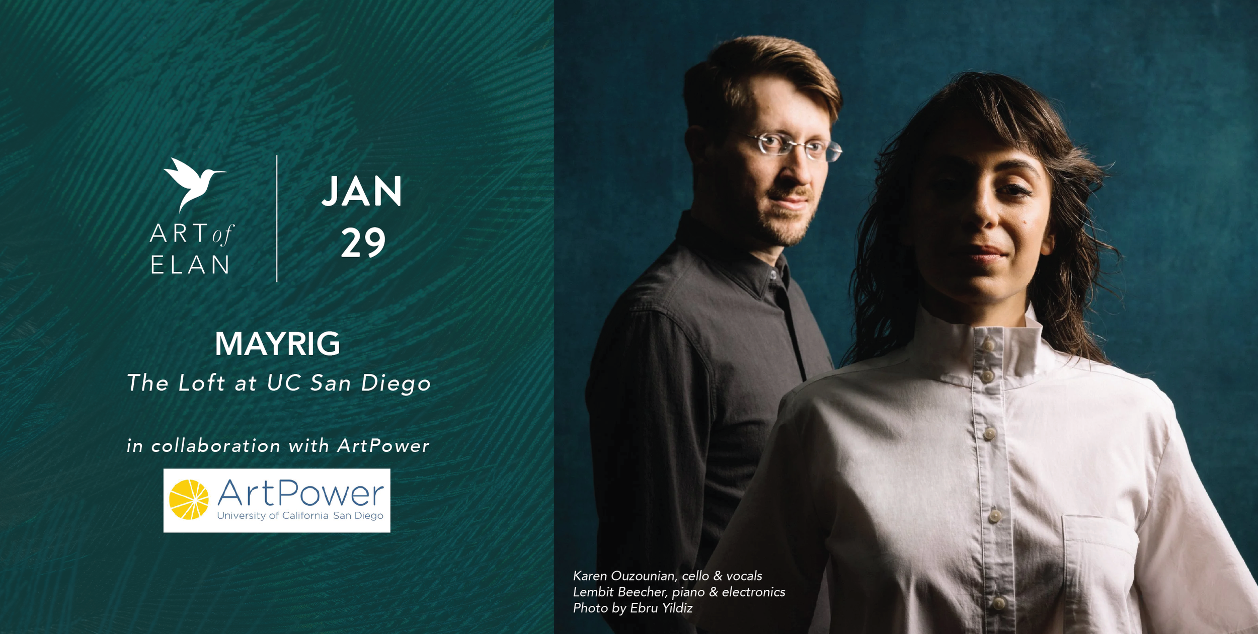 Art of Elan continues its partnership with UC San Diego’s ArtPower with a deeply personal, intimate program centered on the human voice entitled “Mayrig” (“mother” in Armenian). The show was created by Karen Ouzounian and Lembit Beecher for cello with electronics, piano and vocals. The voices of Karen’s mother and grandmother are interwoven with original arrangements of Armenian music of her family’s past home of Anatolia, songs and stories drawn from their post-genocide home of Lebanon, and the beloved music of Charles Aznavour. Opening and closing the program is Marin Marais’ Les Voix Humaines, music from hundreds of years ago providing a window into the present.