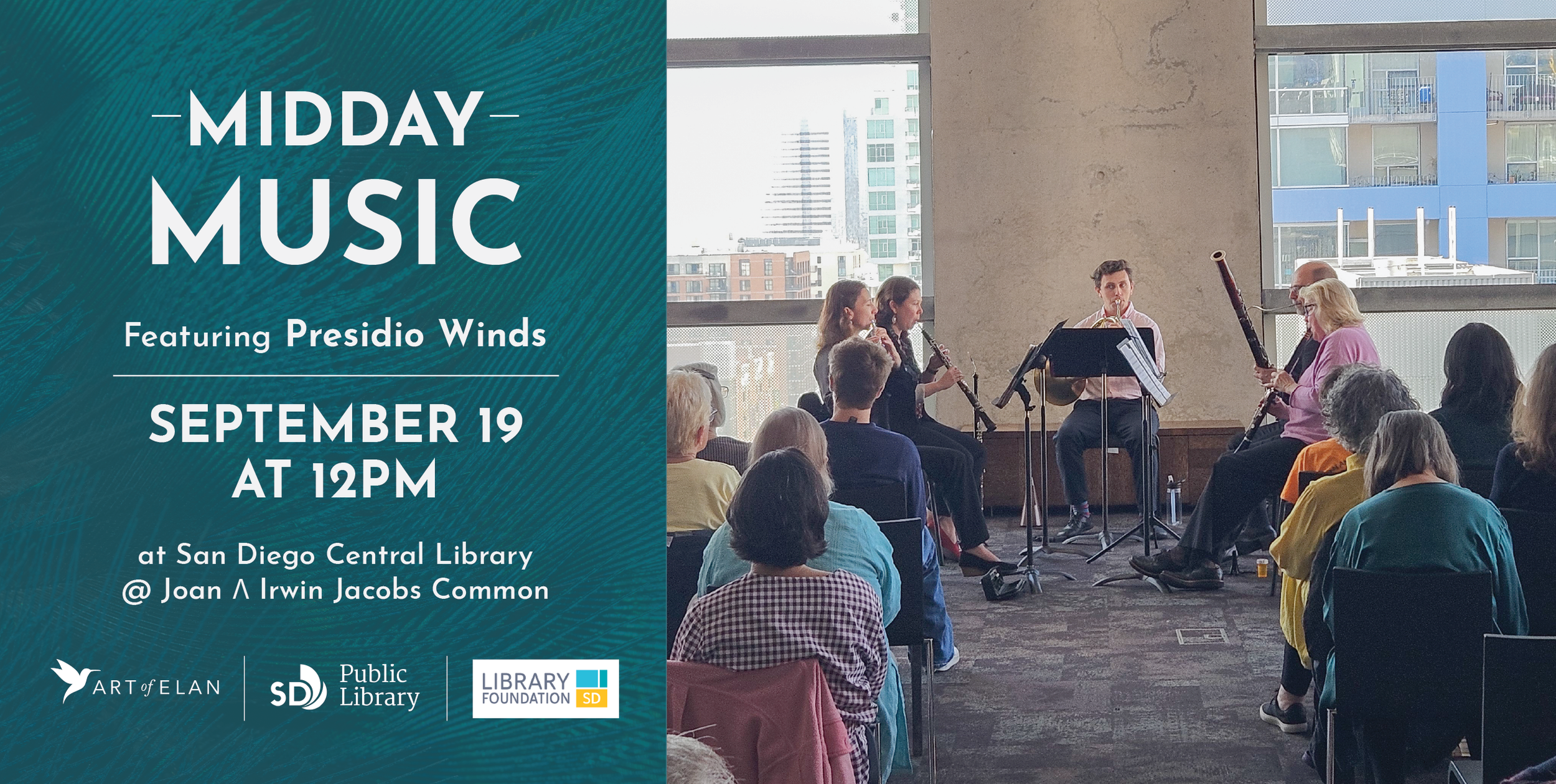 “Midday Music” is a free, lunchtime concert series held in collaboration with the San Diego Public Library, taking place on select Fridays throughout the year in the Shiley Special Events Suite on the top floor of the Central Library @ Joan Λ Irwin Jacobs Common, where concertgoers are invited to bring their lunch and enjoy carefully curated chamber music along with gorgeous views of the city. This brand-new series and partnership is dedicated to the memory of James R. Dawe, a longtime arts advocate in San Diego and supporter of public libraries.
